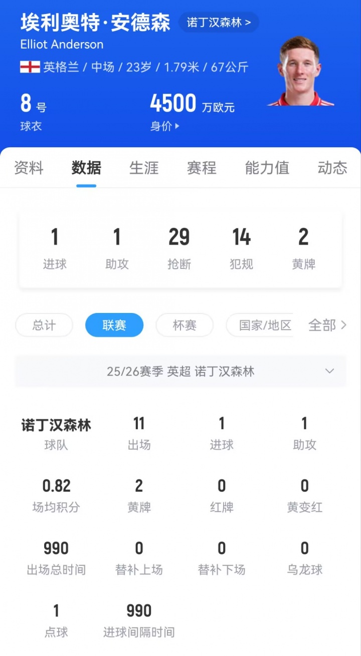 23岁的丛林中场埃利奥特·安德森本赛季为丛林在联赛已出场11次,孝敬1球1助攻。当今他的德回身价为4500万欧元。