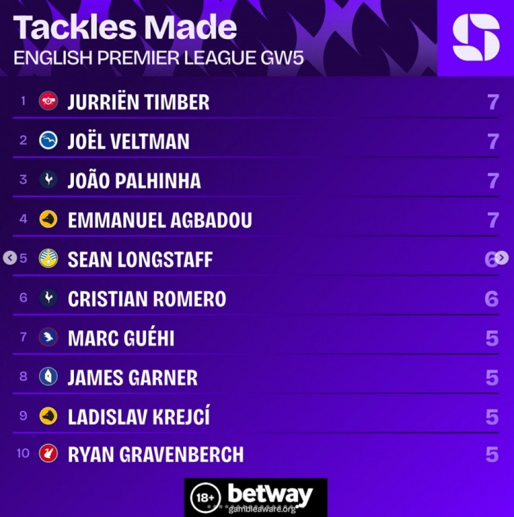 9月24日讯 英超第5轮战罢,squawkafootball列各项数据名次,廷伯、帕利尼亚等四名球员是本轮完成抢断次数最多的球员,各有7次。