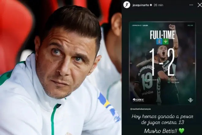 主裁判伊奥苏-加莱奇的规矩表露激励好多东说念主不悦,其中就包括华金,这位贝蒂斯名宿在Instagram写说念:“今天咱们尽管是靠近13个东说念主比赛,但还是赢了。”