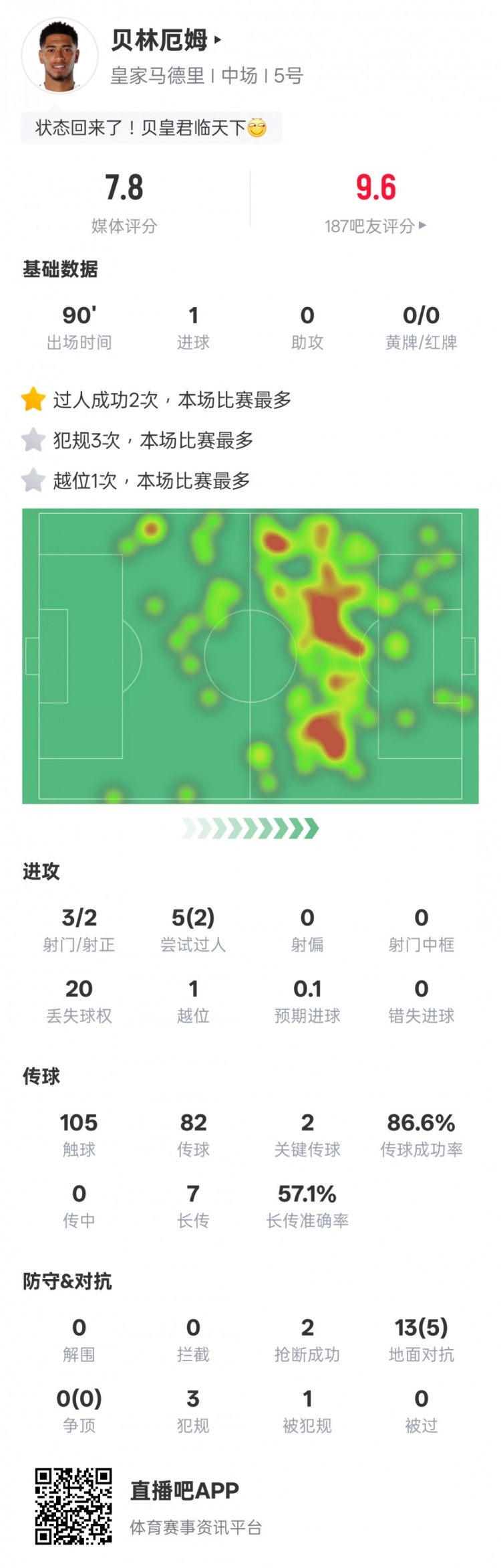 贝林厄姆本场数据:1进球2要津传球2过东说念主班师2抢断,评分7.8