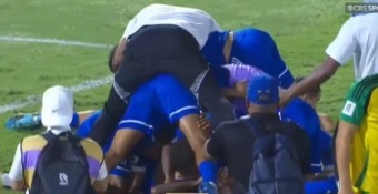 赛后,库拉索球员容颜庆祝,替补球员冲入场面,有些球员径直趴在地上。