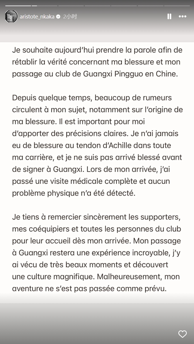 我诚意感谢球迷、队友以及俱乐部合座成员从我抵达第一天起赐与的浓烈接待。在广西的时光是一段不凡的资历,我不仅渡过了精彩时光,更晓悟了娟秀的中国文化。缺憾的是,我的征途未能按预备伸开。