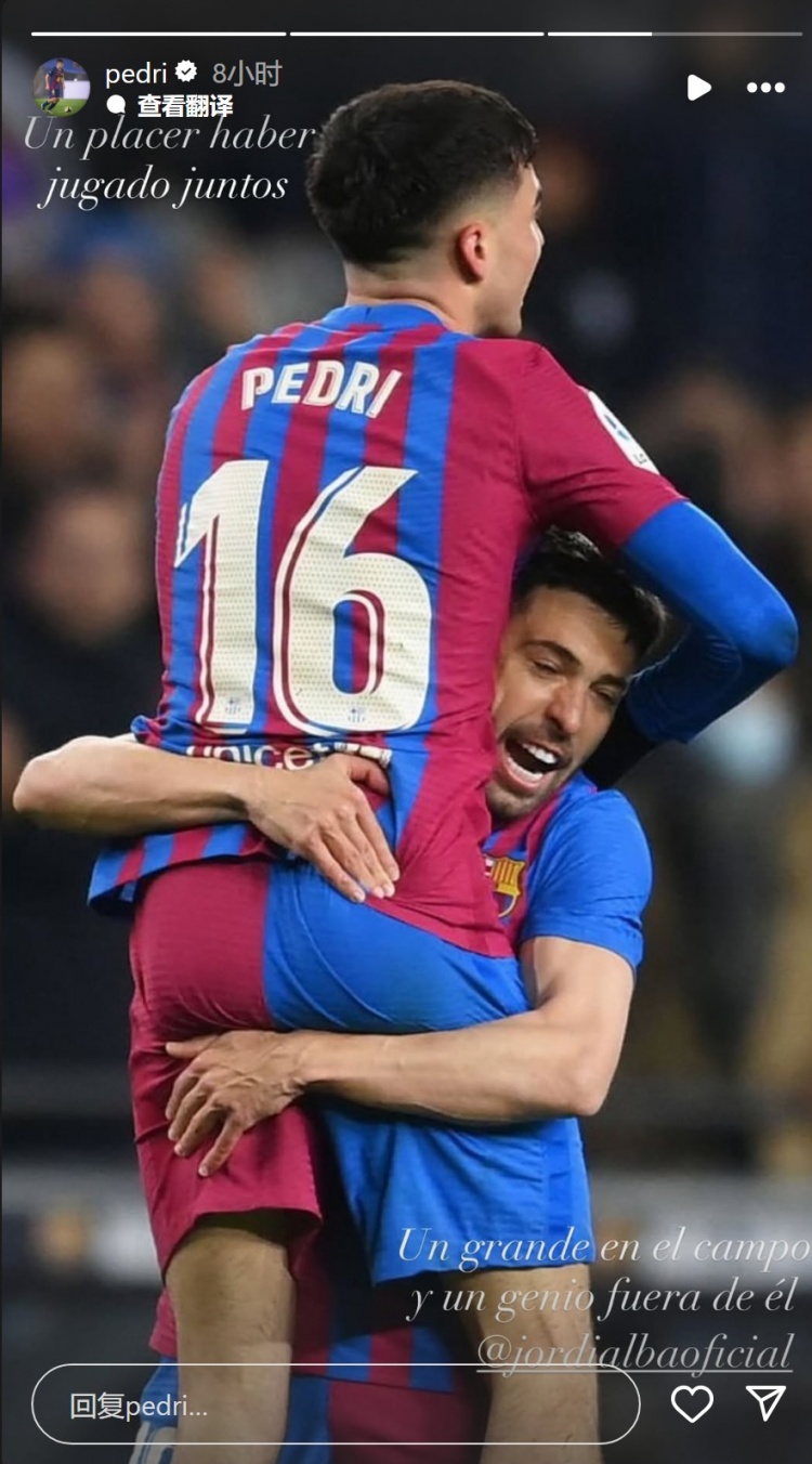 10月8日讯 阿尔巴文书将在本赛季猖狂后退役,巴萨中场佩德里社媒发文致意。