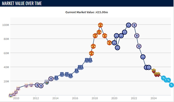 卢卡库曾在遵守曼联和国米时身价达到1亿欧,其时他永别是25岁和28岁。切尔西在2021年曾为他支付1.13亿欧,然则买入之后只用了一个赛季,后头接连租赁国米和罗马并最终卖给那不勒斯。