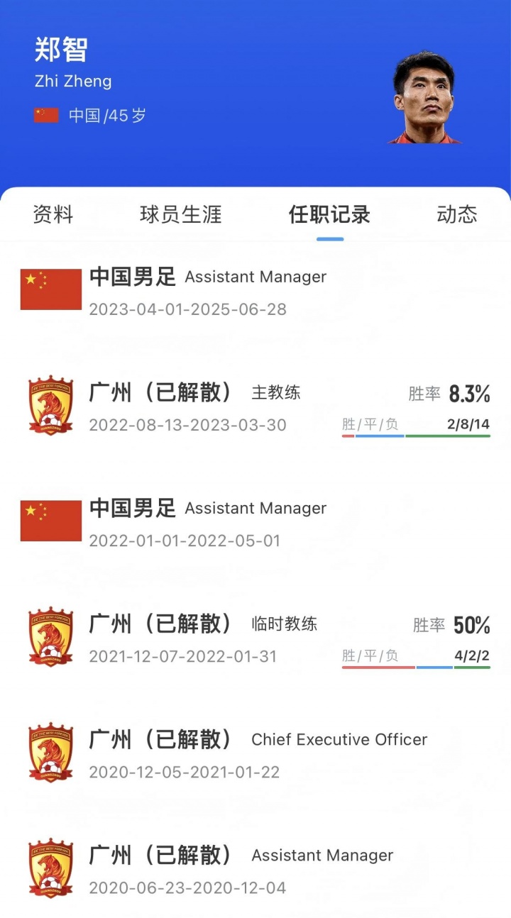 2021年12月7日,郑智出任广州队履行主锻练兼球员。2022年1月,41岁的郑智出战广州队vs长春亚泰的中超比赛,这是他处事生存临了一次出场。2022年8月,郑智出任广州队主锻练。 2023年2月27日,郑智出任国足助教 。跟着伊万离任,郑智也退出洋足助教团队。