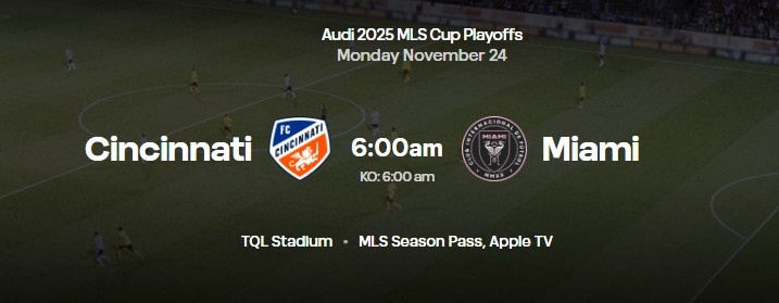 迈阿密海外将在好意思职联1/4决赛迎战辛辛那提FC,阐发俱乐部官网显现,比赛时候在11月24日周一黎明6点进行。