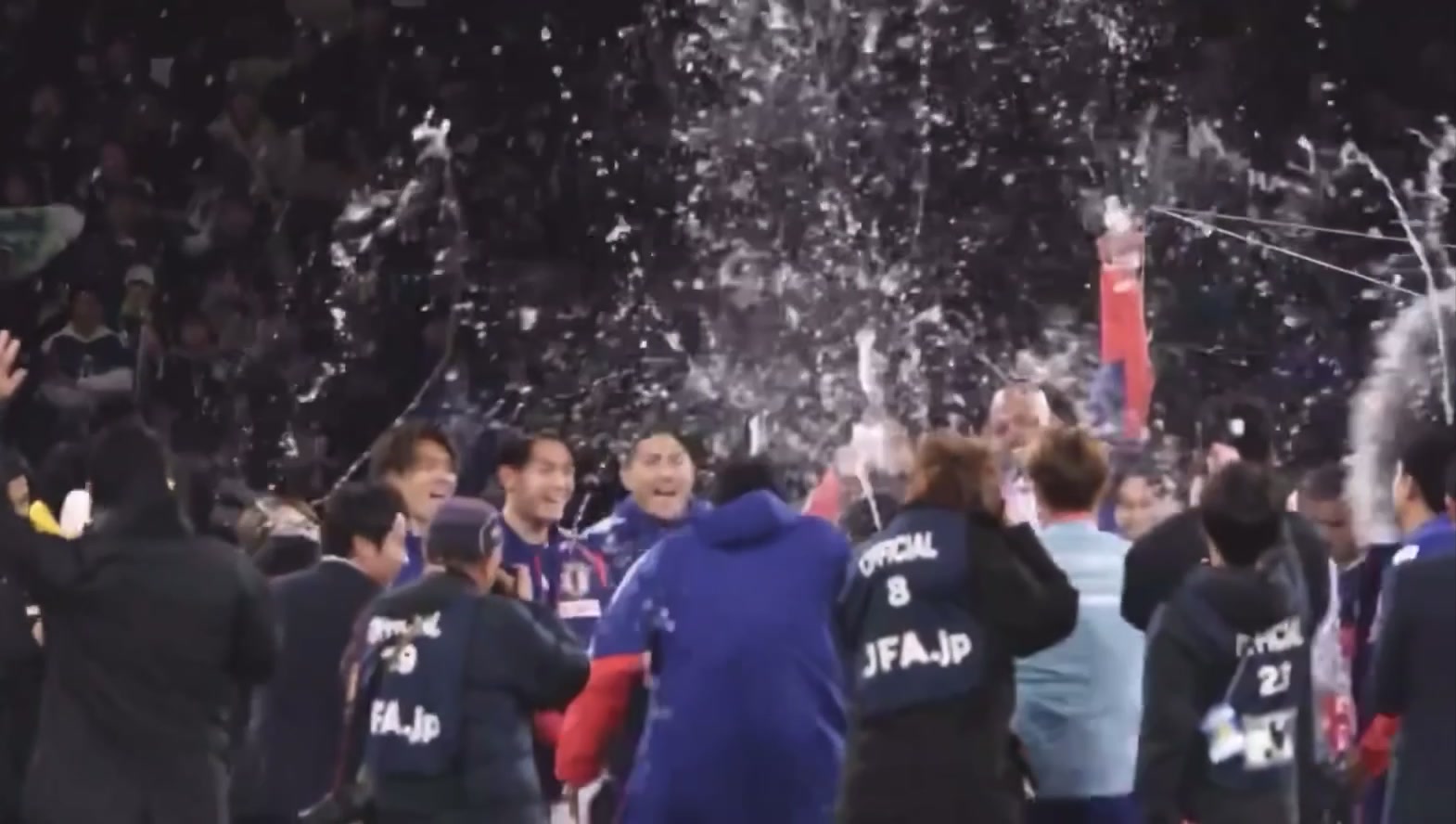 3-0打败玻利维亚后,日本队球员集体向握教100场的森保一奉上祝颂