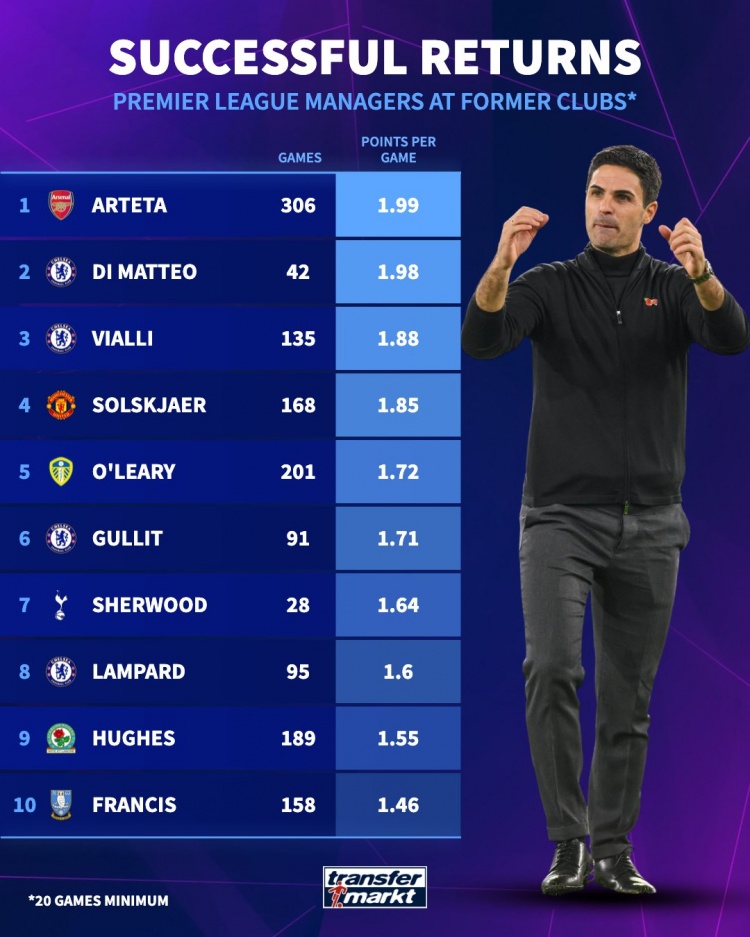 捏教英超老东家场均积分名次:阿尔特塔1.99分居首,迪马特奥次席