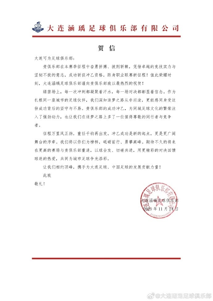 大连可为官方写谈:感谢同城昆季球队大连英博足球俱乐部 、大连鲲城足球俱乐部 、大连涵瑀足球俱乐部发来的贺信。2026赛季,大连可为行为办事联赛的新军,向英博、鲲城两位老老迈学习,期待咱们所有生机合营,雕刻前行!祝贺大连涵瑀八成在附加赛中脱颖而出,来岁再续德比荣光!