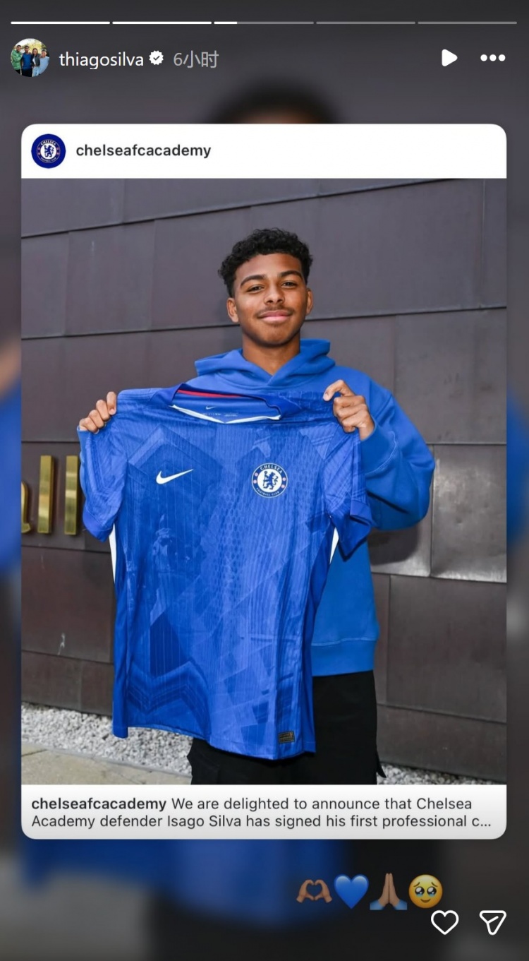 蒂亚戈·席尔瓦17岁的犬子伊萨戈与切尔西签署干事协议,蒂亚戈·席尔瓦社媒转发签约相片,并配上蓝色心形脸色记号。