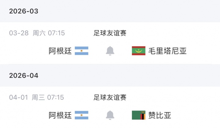 阿根廷将于北京时间3月28日7:15对阵毛里塔尼亚,4月1日7:15对阵赞比亚。