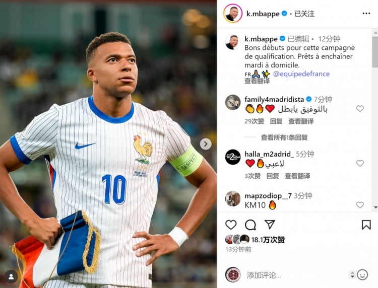 姆巴佩社媒晒出比赛相片,配文:“世初赛的邃密开局,准备好周二在主场再接再厉。”