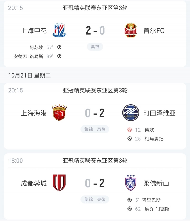 上海申花2-0打败首尔FC,上海海港0-2不敌町田泽维亚,成王人蓉城0-2不敌柔佛新山。