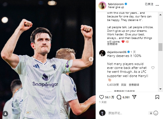 “马奎尔100%值得。经验过像他那样的事,不会有太多球员还能这么追想。手脚别称利物浦球迷,我也要说马奎尔干得漂亮!!👏”
