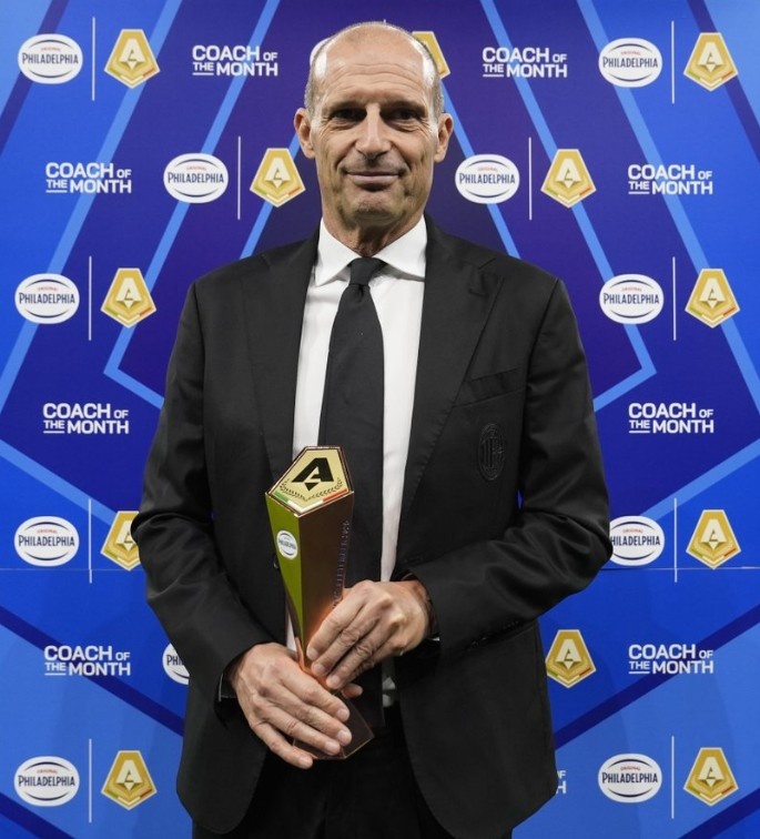 10月25日讯 意甲官方晒照,米兰主帅阿莱格里在米兰对阵比萨赛前领取了九月最好解释奖杯。