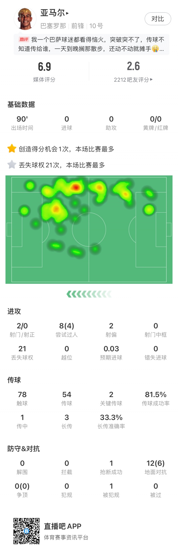 低迷!亚马尔国度德比施展:2射0正,21次丢失球权,媒体评分6.9