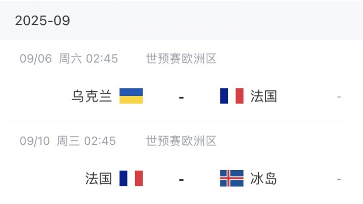 法国国度队将在9月的世欧预中对阵乌克兰和冰岛,小组第别称将平直晋级2026年全国杯。