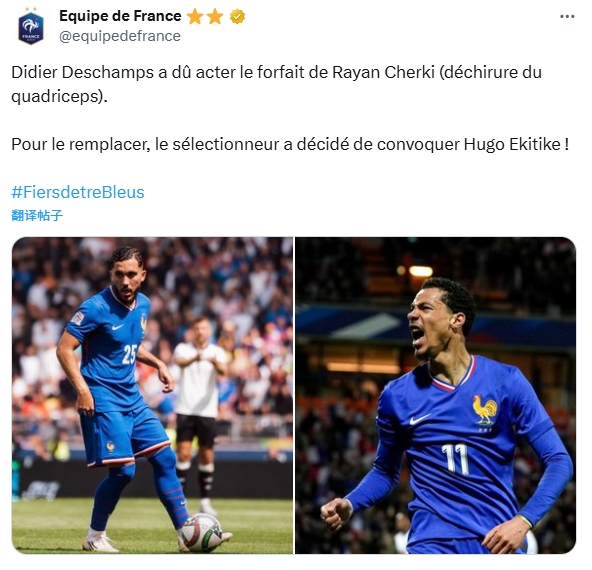 初次入选!法国队官方:谢尔基因伤退出本期名单,补招埃基蒂克