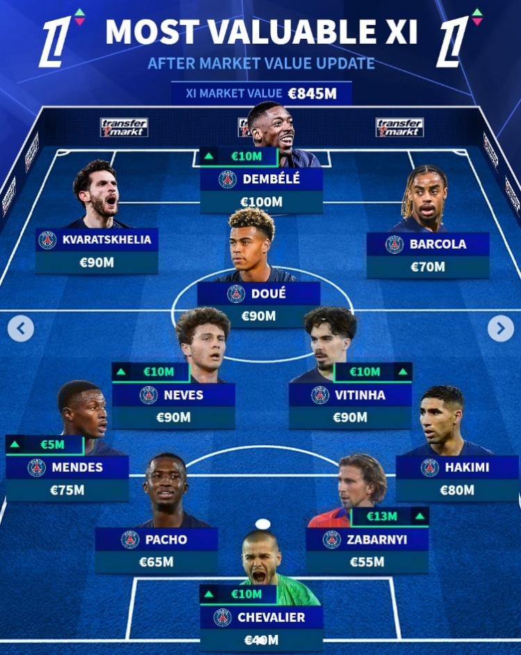 10月11日讯 德转更新了法甲球员身价,并清点了当今身价最高的11东说念主威望,巴黎球员包揽,具体如下: