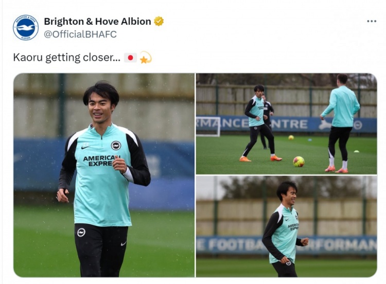 布莱顿社媒晒出三笘薫的相片,阐明这位日本抨击手还原考验,配文:“三笘薫距离复出更近了。”