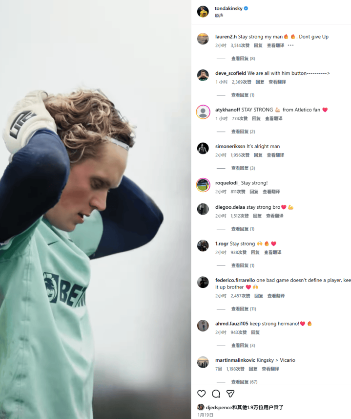 在金斯基的之前的社媒评论区,球迷群体们为他送上安慰: